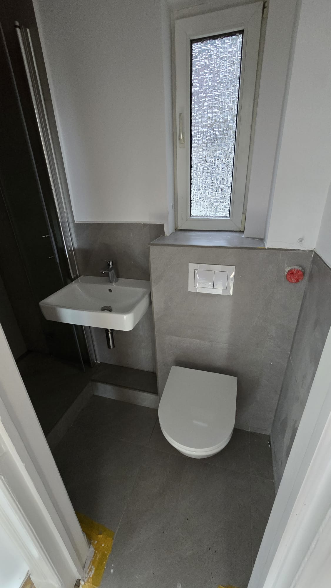 Clever mit Vorwandmodul und Handwaschbecken. Mattgraue Keramik für eine ruhige Optik.