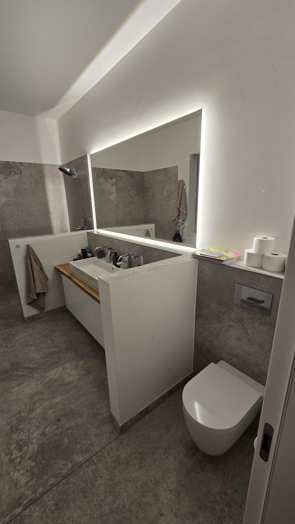 Flächenbündige Spiegelanlage, indirektes Licht und griffloser Waschtisch – modernes Ambiente.