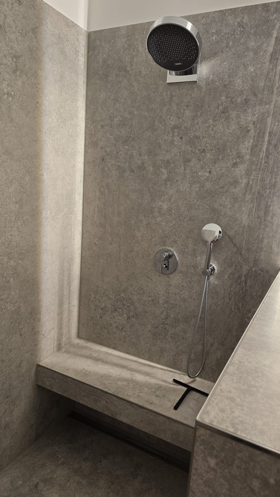 Fugenarm verkleidet, integrierte Bank & Rinne – komfortabel und leicht zu reinigen.
