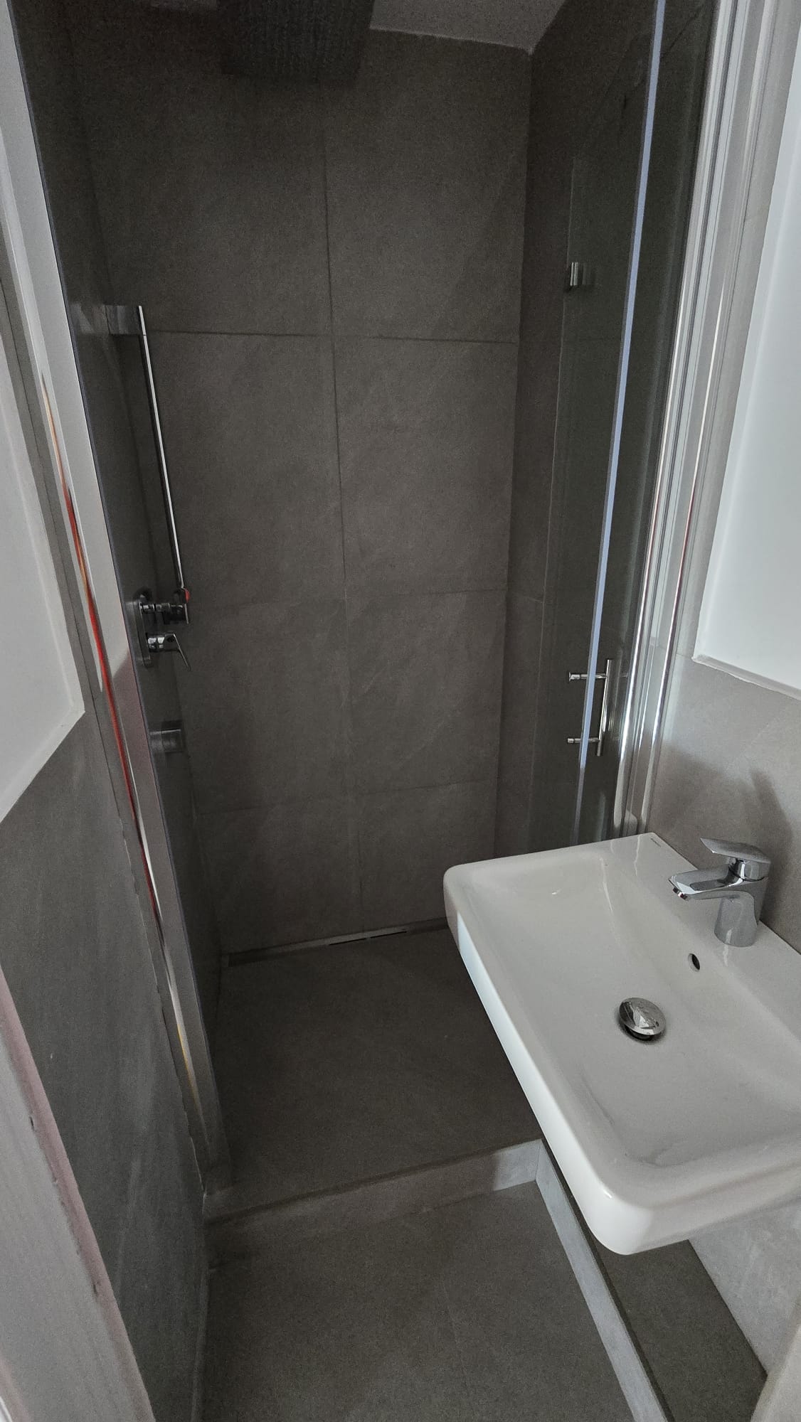Nische optimal genutzt: Glasdrehtür, lineare Armaturen und dezente Ablaufrinne.